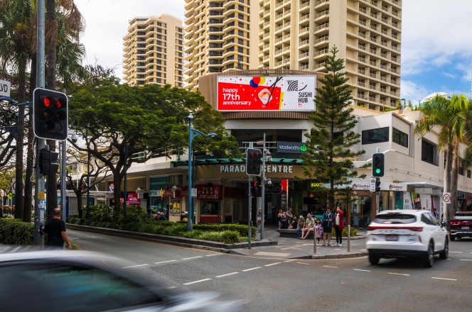 媒体位于黄金海岸冲浪者天堂&卡维尔大道,地处昆士兰州最繁华旅游区,毗邻海滩、购物中心及娱乐设施, 日均人流量超10万,能有效覆盖国际游客、本地消费者及商务人群,品牌曝光强度极高。 冲浪者天堂为全球知名IP,广告自带“度假”“活力”联想,有利于提升品牌高端形象。