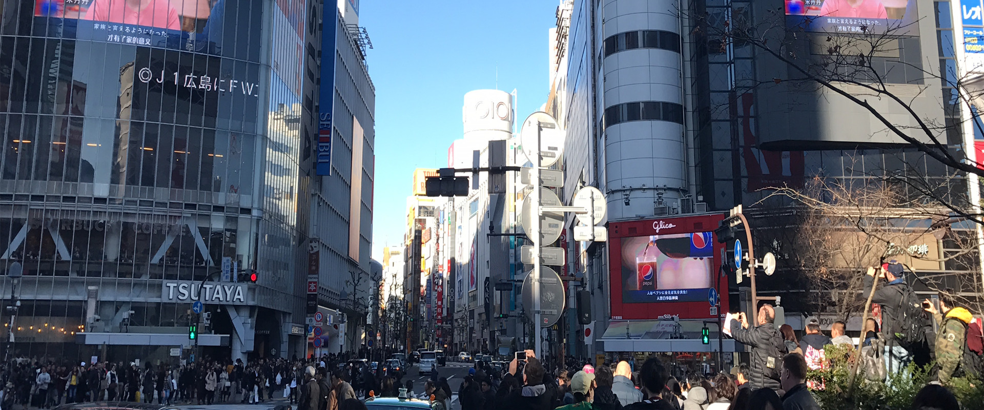 东京涩谷车站前的十字路口是来日游客的必去之处,行人绿灯亮起后,步行者可以从各个方向穿梭街口,这个特色也是各位游客一定会拍照纪念的路口。每次平均穿梭人流量为3000人,每天平均人流量达到40万人,高峰期可达百万人。是涩谷四连屏中离地最低的一块,与人们的视线范围完美匹配。