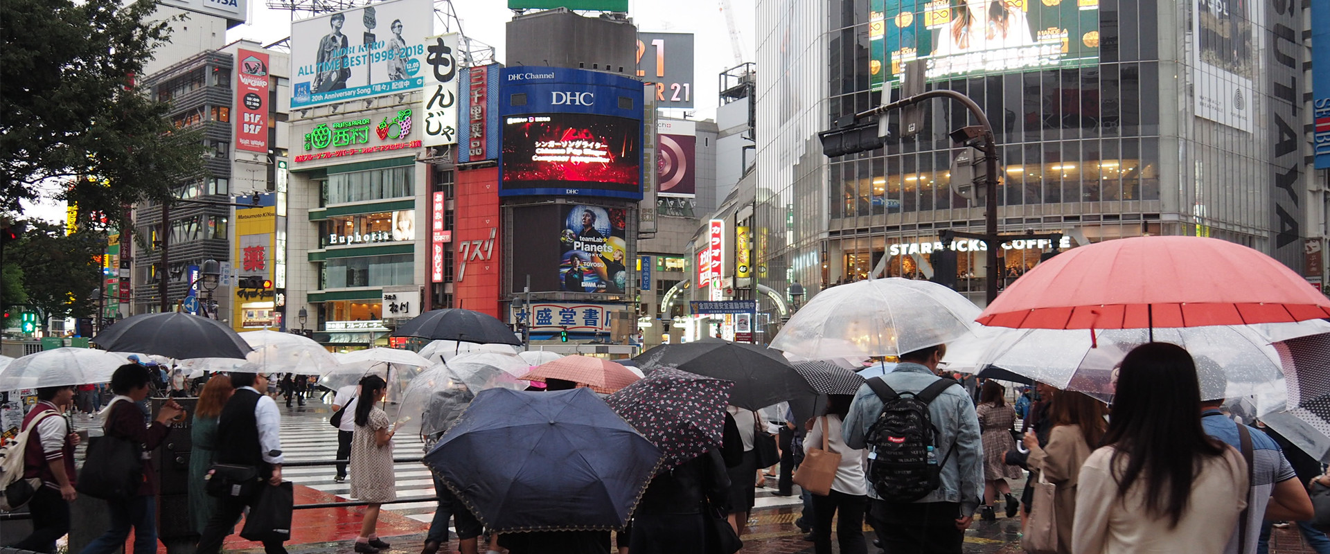 东京涩谷车站前的十字路口是来日游客的必去之处,行人绿灯亮起后,步行者可以从各个方向穿梭街口,这个特色也是各位游客一定会拍照纪念的路口。每次平均穿梭人流量为3000人,每天平均人流量达到40万人,高峰期可达百万人。屏幕因著名的DHC集团而被周知。