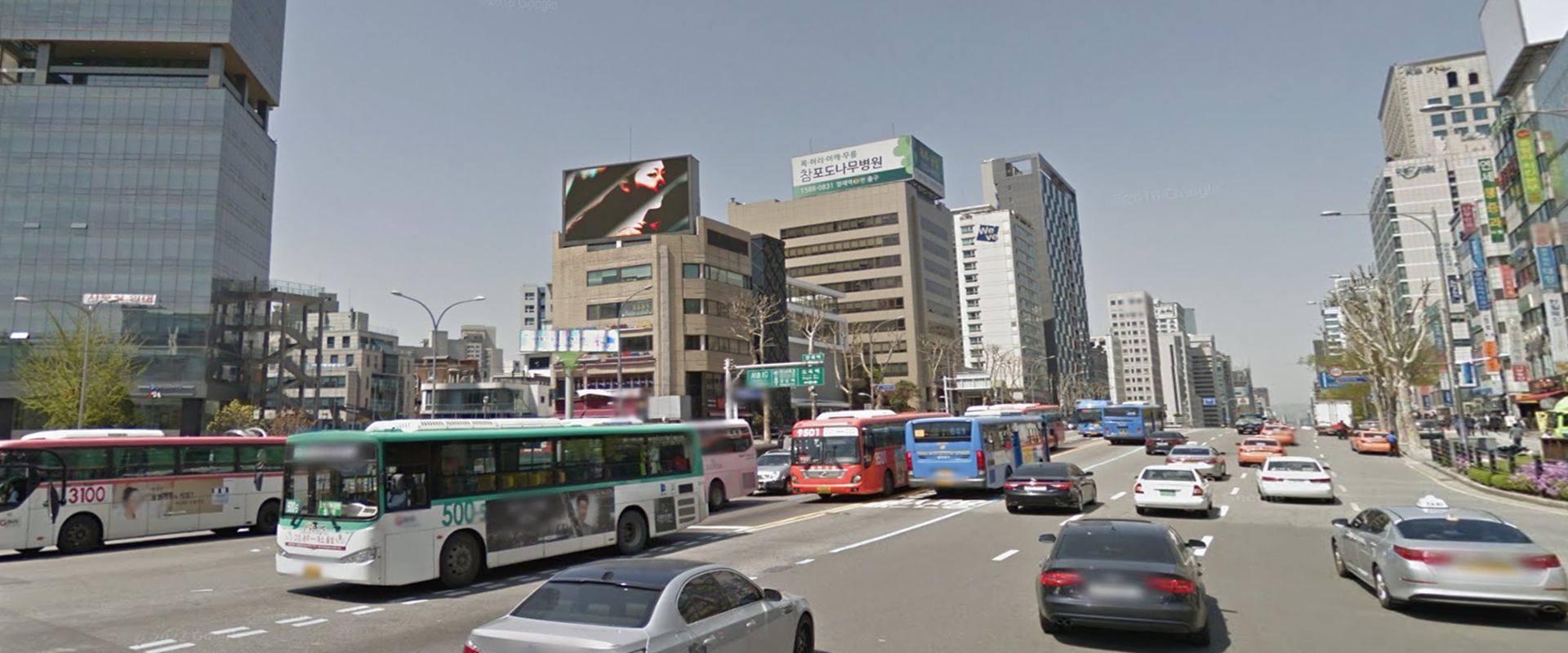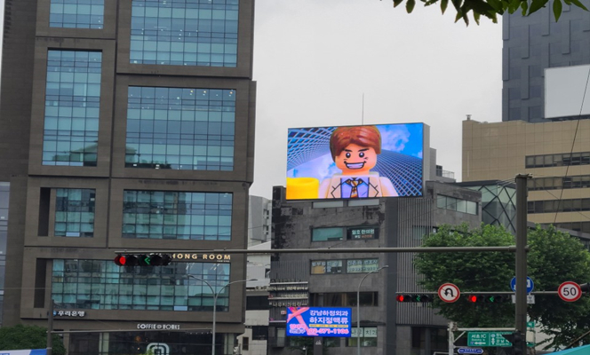 从城南到良才站,良才十字路口前方的 5 层大楼顶部看到电子牌!位于韩国首尔江南公路与南环路交叉口,有名的交通拥堵区,车辆停留时间非常长。距离地铁三号线很近,同时还是巴士和过境车辆的停靠区。媒体位于楼顶,视觉效果好,曝光率高。