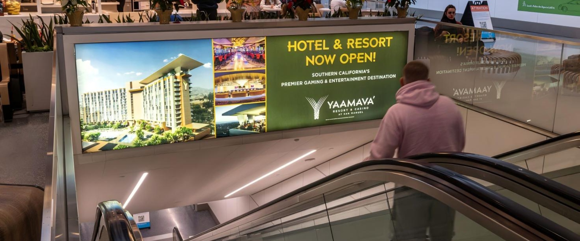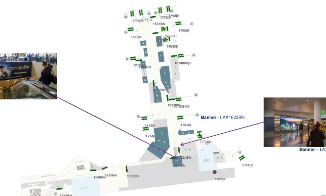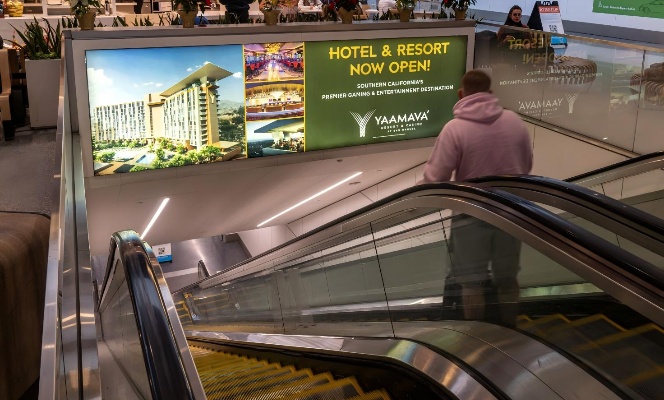该媒体位于美国洛杉矶国际机场T1航站楼电梯处,可以覆盖去往行李提取处的离港和到港旅客, 由于离地位置高,从美食广告就可以看到广告内容,覆盖范围广。