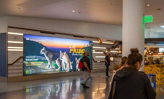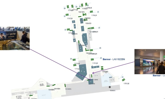 该媒体位于美国洛杉矶国际机场T1航站楼,可以覆盖行李提取出旁通道的 美食厅用餐或者路过的到港和离港旅客。覆盖范围广,从通道到登机口, 美食广场以及行李提取处等位置都可以看到广告内容。