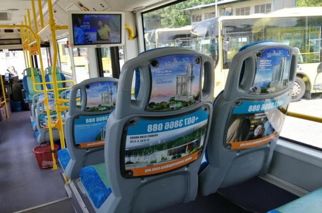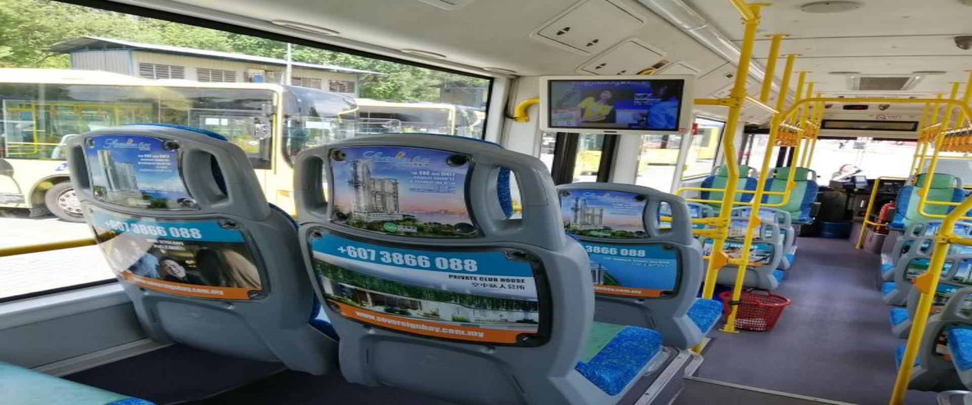 新加坡-马来西亚跨境巴士车内椅背广告,将您的宣传内容直接置于乘客的视觉焦点区,形成无可回避的面对面接触。 乘客在乘车过程中,其视线自然落在前方座椅背部,使广告获得了持续、深度的沉浸式曝光。