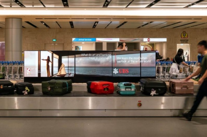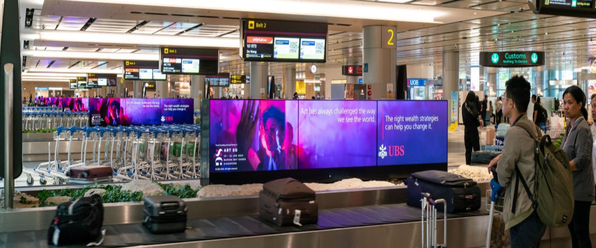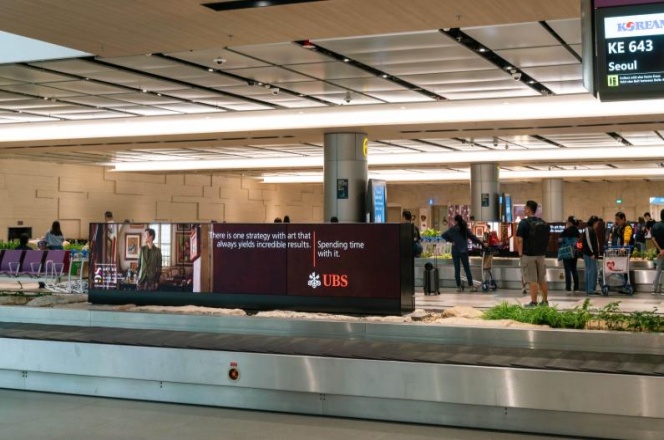 媒体位于新加坡樟宜国际机场4号航站楼到达行李传送区域,针对到达旅客的最大覆盖范围, 通过在停留时间长的区域重复显示, 可以让旅客加深对品牌和产品的印象。