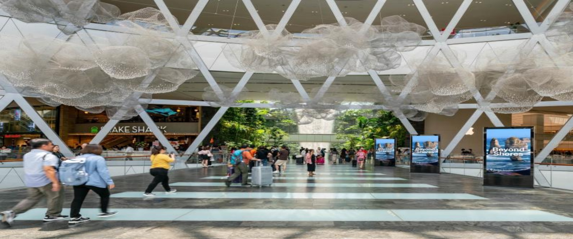 媒体位于新加坡星耀樟宜,覆盖所有星耀樟宜的顾客,数量众多的LED立屏形成宣传网络,分布在各个楼层,有利于加深旅客对于品牌的记忆。