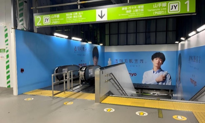 其核心优势在于对站内最主流、最高频通勤人流的强制性垂直封锁与高密度触达。 该位置是连接站厅与山手线、埼京线等核心站台的咽喉要道,乘客在上下楼梯时 视线自然聚焦于墙面,行进速度放缓,形成了无可回避、专注度高且停留时间 相对延长的黄金曝光场景。广告在此不仅能覆盖每日数百万的通勤与商务人群, 更因其处于检票后、乘车前的关键决策动线,能有效植入品牌信息,是短时间内 于东京顶级枢纽建立广泛大众认知、实现高频次记忆强化的战略级点位。