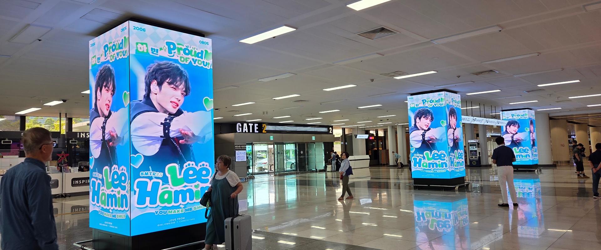 金浦机场_国际航线_1层到达大厅一般候机室方柱广告套装(IL-1-3), 设置在金浦机场国际航线1层到达大厅候机室的LED方柱广告,可向出入机场的旅客投放广告, 位置靠近机场问讯处,在人流量大的到达区域内可实现高效广告投放