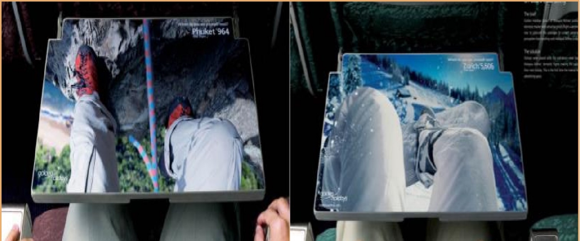 小桌板贴是置于机舱内桌板上的广告方式。以标贴的形式进行广告信息传播的一种独特的广告媒体。位于每位旅客座位正前方,广告注目率极高,具有良好的广告传播效果。是旅客进入机舱首先接触到的广告内容,有良好的视线角度,广告效果得以充分传播。