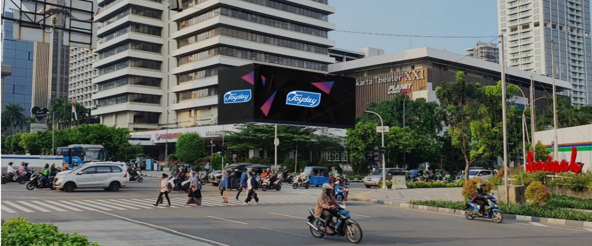 媒体位于雅加达中心雅加达剧院楼体,是雅加达为数不多的异形LED屏之一,面向主要交通要道,邻近政府办公楼。附近遍布聚会场所、会所、写字楼、酒店、购物中心、公寓以及Trans Jakarta Sarinah 地铁站。