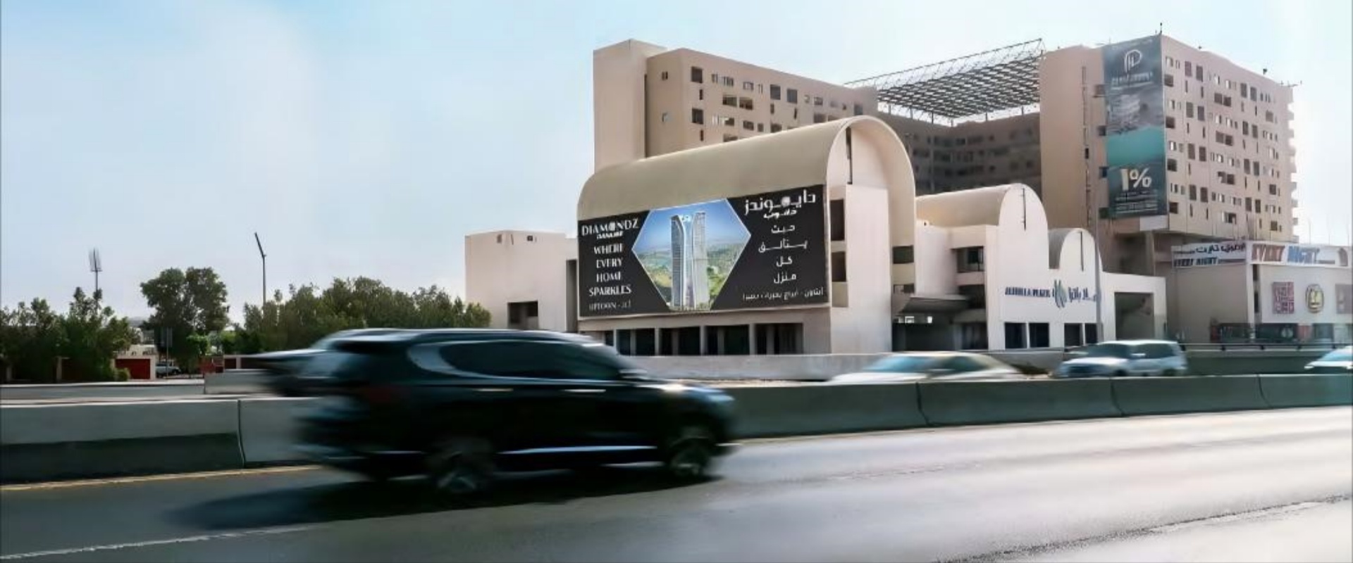 作为迪拜最早的购物中心之一,Al Mulla Plaza 是本地居民和老迪拜区域的标志性建筑,地标性强,便于广告记忆与传播。位于迪拜主干道 Al Ittihad Road 上,连接迪拜与沙迦,日均车流量巨大,是通勤必经路线之一。广告受众不仅包括迪拜居民,还涵盖来自沙迦、阿治曼等周边酋长国的通勤族和游客。广告牌位置开阔无遮挡,白天与夜晚均具高可见性,可实现长时间曝光。节假日和购物季,Al Mulla Plaza 及周边商圈会吸引更多人流,进一步提升广告的曝光机会。