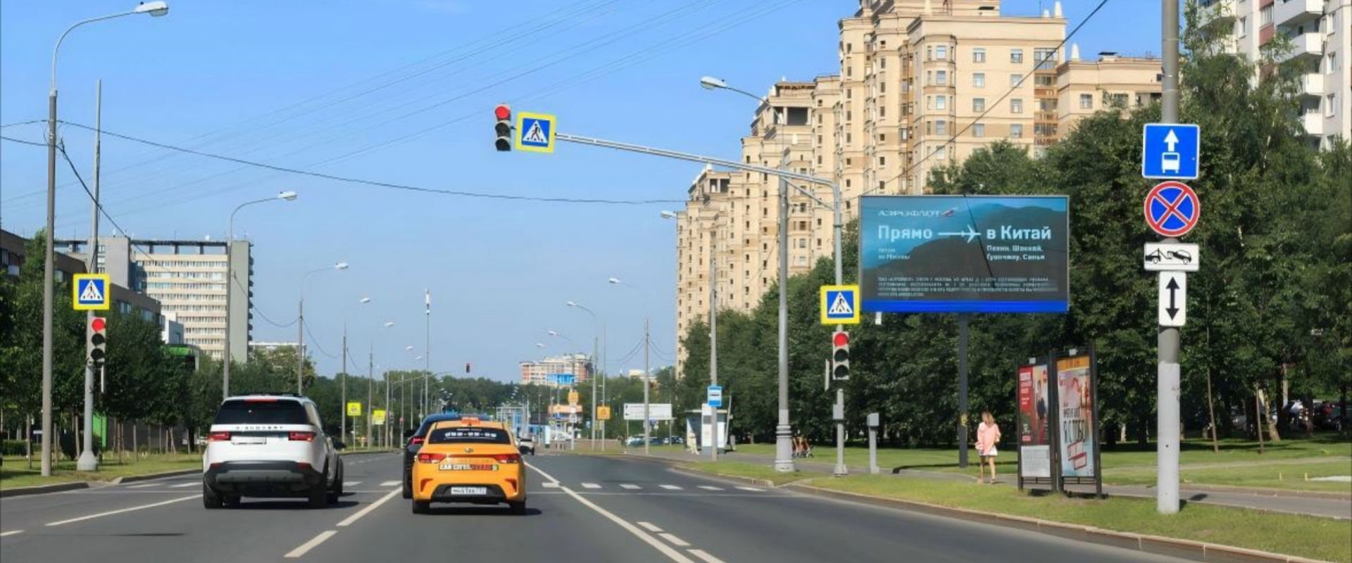 距离交叉口红绿灯仅 200 米,意味着车流在此处会因等待信号灯或减速通行而自然放缓。无论是直行车辆还是即将转弯进入 Shuvalova 街的车辆,乘客(尤其是副驾和后排)会有更多时间关注周边环境,广告信息更容易被 “强制接收”。相比无红绿灯的连续车流路段,此处的曝光有效时长显著增加,信息记忆度更高。Michurinsky Avenue 作为主干道,本身承载着密集的通勤、跨区车流;而 Shuvalova 街作为与之交汇的支路,连接着周边居住区、学校或小型商业区,带来另一股定向车流。