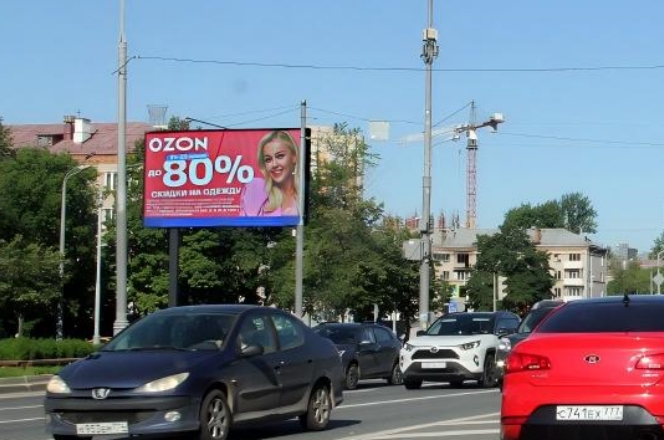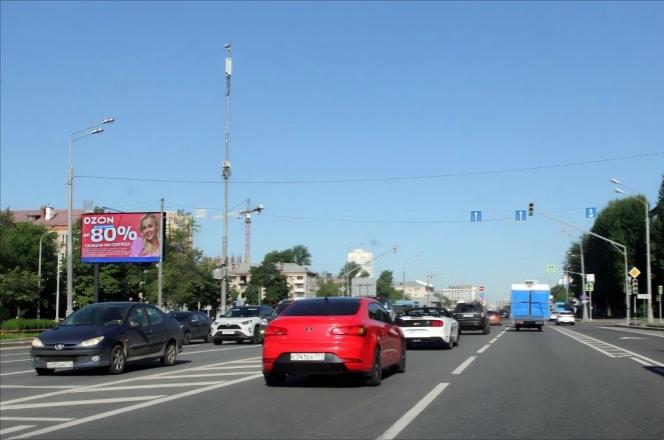 车辆经过 Skryabina 街交叉口的红绿灯后,会从 “等待状态” 转入 “平稳行驶”,但驾驶员和乘客的注意力仍处于对周边环境的 “主动扫描” 中(尤其刚过路口时,需确认道路状况)。该位置作为 “过路口后的首个显著视觉点”,能自然承接受众的视线延续,相比路口处被信号灯、斑马线等交通元素分散注意力的场景,广告信息更易被清晰接收,且曝光时长稳定.