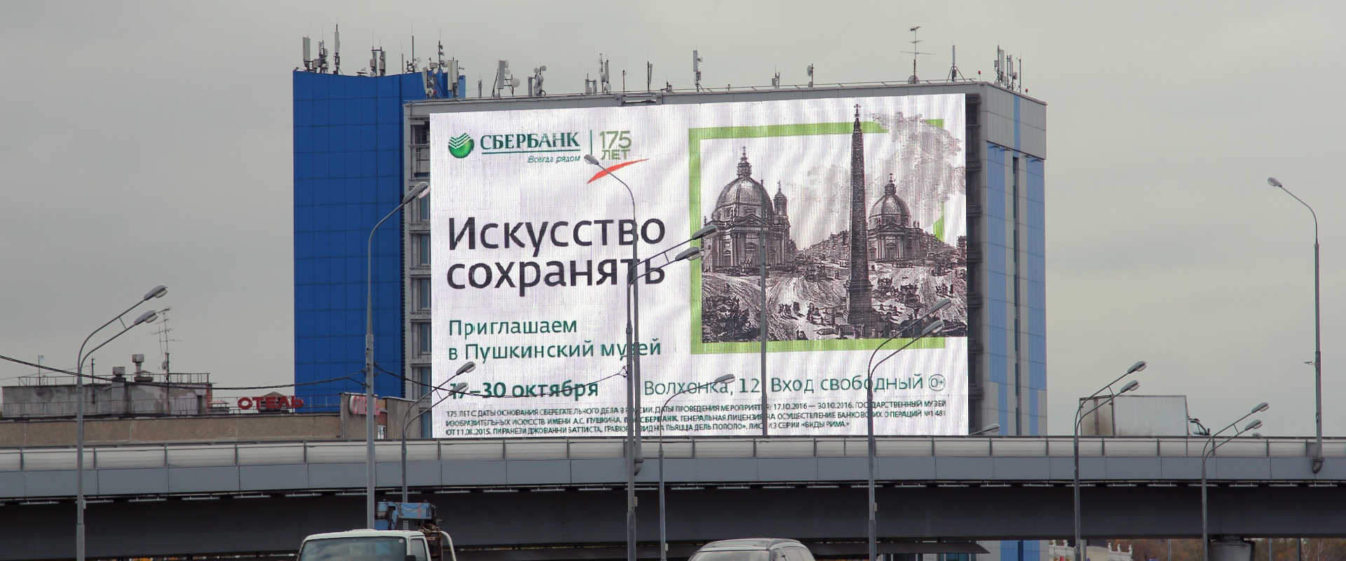 该媒体位于莫斯科莫扎伊斯科高速公路。该媒体位于公路旁建筑物外墙,大屏面积巨大,是俄罗斯目前较大的户外电子大屏,位于十字路口处,多方车流汇入,宣传效果极好。