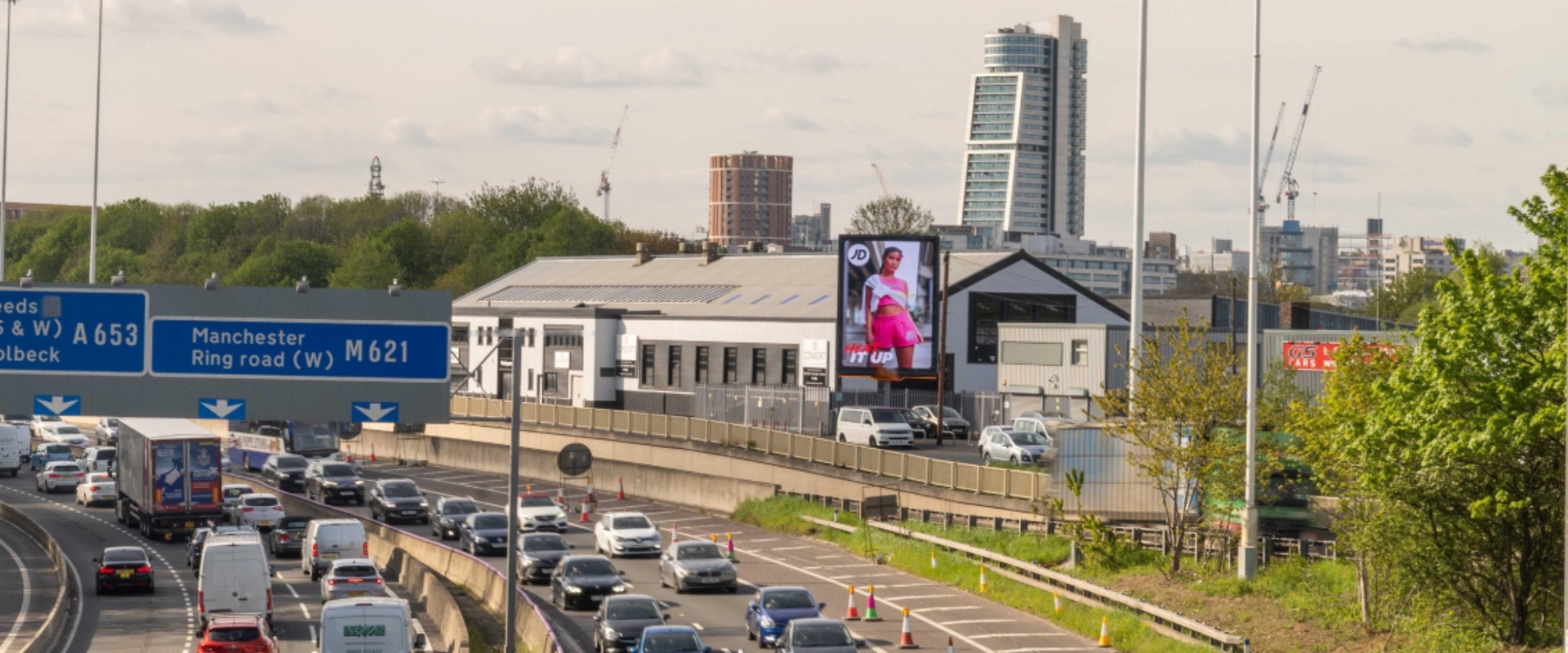 该屏幕接近利兹市中心在M621通道旁边,位于M621西行路口3号,这个面板塔在高速公路上面向从南约克郡城市如谢菲尔德前往纽卡斯尔的交通,到达附近的城镇布拉德福德,哈罗盖特和约克都很容易。该地点也非常靠近利兹联的足球场埃兰路,以及皇冠点购物公园和Junction 32等零售商店和利兹码头的商业中心。