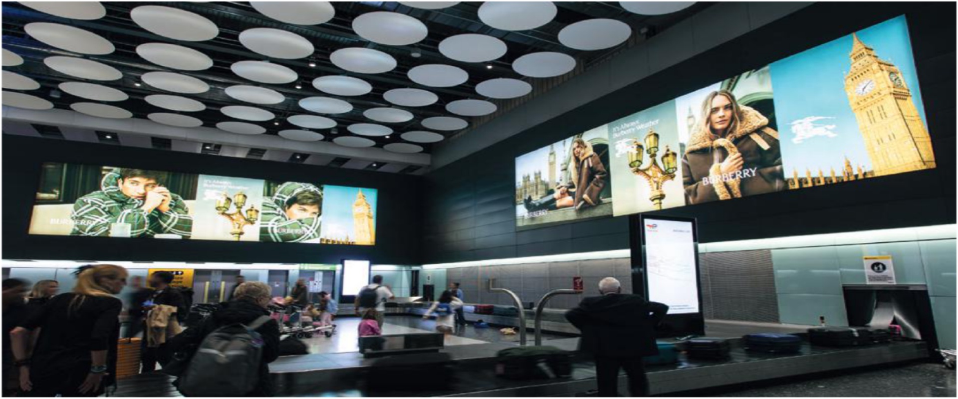 媒体占据了T5行李提取大厅的显眼位置。这两组广告位各包含五个灯箱,分别位于国际和国内行李提取处上方,面向乘客。 其中一组灯箱位于行李提取大厅内所有行李传送带上方,覆盖所有抵达5号航站楼的旅客。