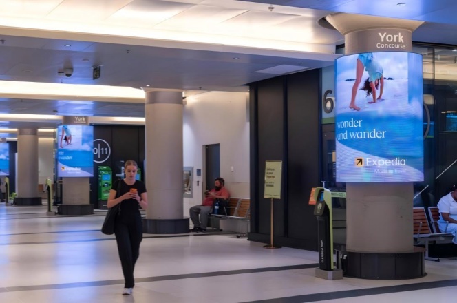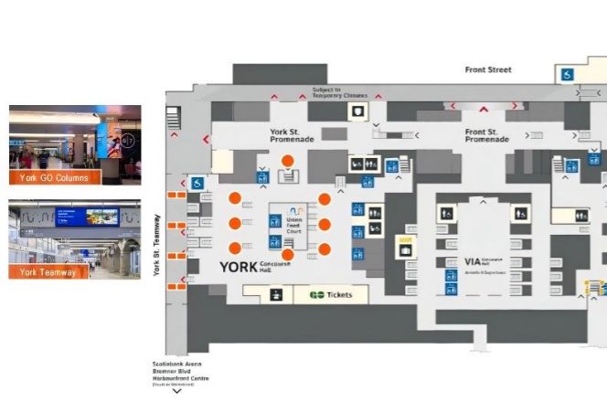 Union Station 是加拿大最大的铁路枢纽,也是多伦多最繁忙的交通中心,每天有数十万通勤和旅行人群经过。站点周边是金融区,聚集大量高收入的商务人士、白领和游客,广告受众消费能力强。地铁、火车、长途汽车及机场快线(UP Express)在此交汇,广告能够触达本地居民、跨城通勤者和国际旅客。电子广告屏设置在人流必经区域,乘客候车、换乘和通行时均可反复看到,增强品牌记忆。电子屏幕可播放视频、动画和动态图像,视觉冲击力强,更能吸引注意力。在加拿大地标性车站投放广告,有助于提升品牌国际化和权威形象。