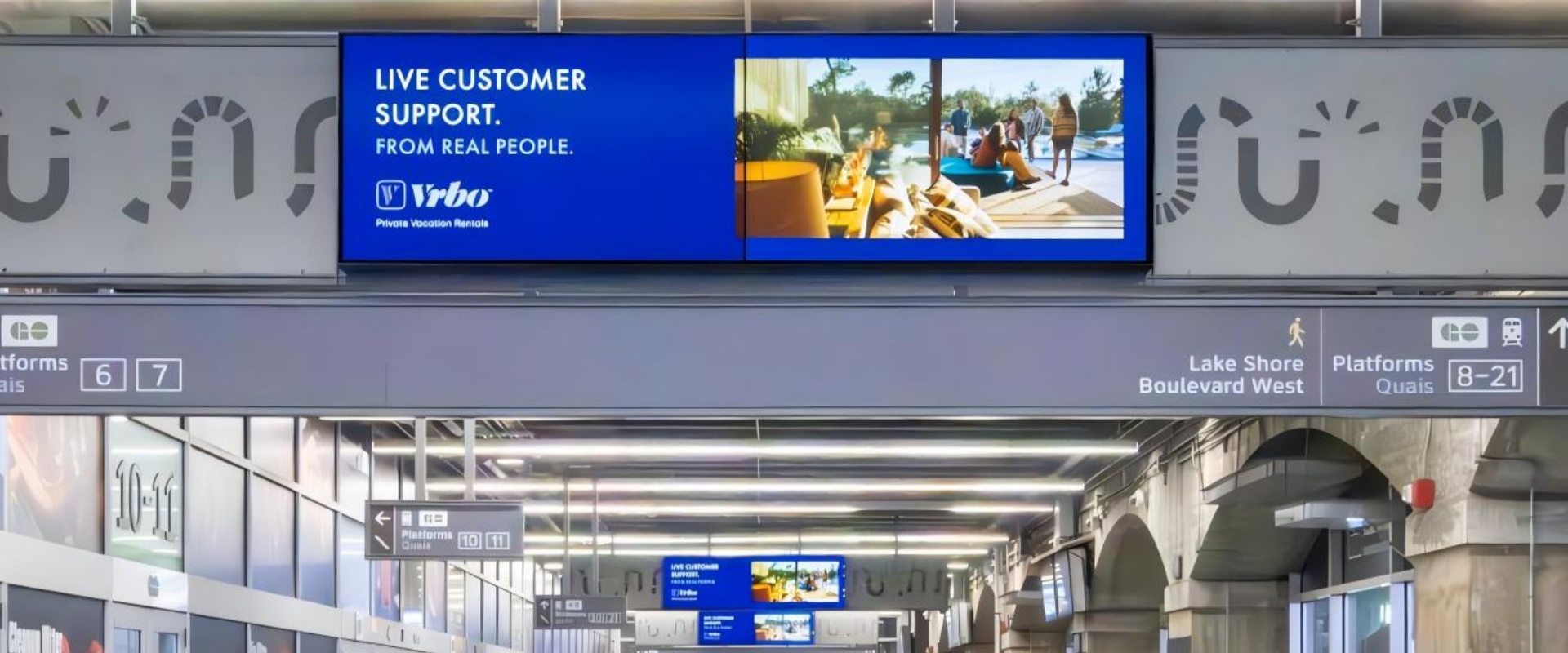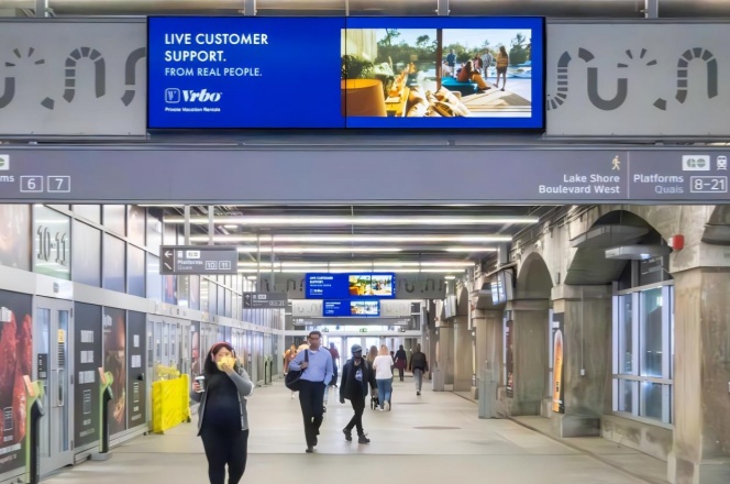 Union Station 是加拿大最大的铁路枢纽,也是多伦多最繁忙的交通中心,每天有数十万通勤和旅行人群经过。站点周边是金融区,聚集大量高收入的商务人士、白领和游客,广告受众消费能力强。地铁、火车、长途汽车及机场快线(UP Express)在此交汇,广告能够触达本地居民、跨城通勤者和国际旅客。电子广告屏设置在人流必经区域,乘客候车、换乘和通行时均可反复看到,增强品牌记忆。电子屏幕可播放视频、动画和动态图像,视觉冲击力强,更能吸引注意力。在加拿大地标性车站投放广告,有助于提升品牌国际化和权威形象。