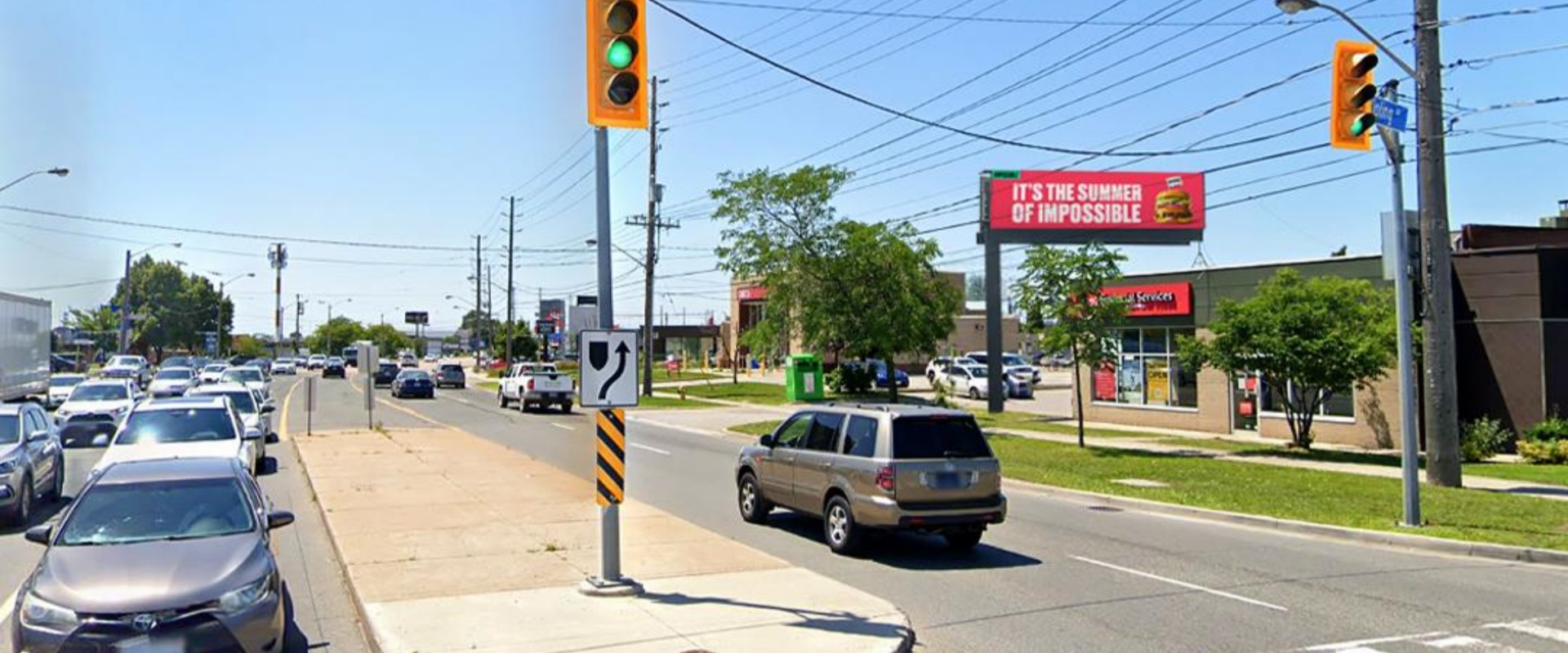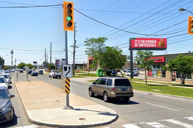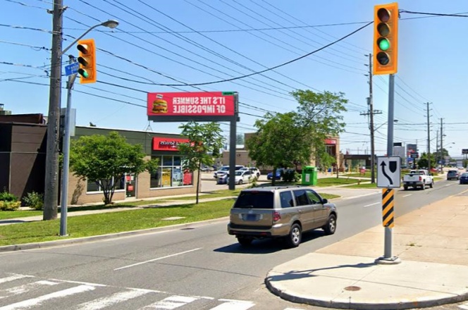 位于 Rexdale Blvd. 与 Kipling Ave. 的交叉路口,属于高流量节点,日常车辆与行人基数大,能实现广告的广域覆盖,触达更多潜在受众。具备长视线条件,车辆在远距离即可看到广告,有充足时间接收信息,避免因距离过近、停留时间短导致的 “无效曝光”,大幅提升信息接收完整性。临近银行、汽车经销商与零售店,可同时触达有金融服务需求(如理财、办卡)、汽车消费需求(购车、维修)及日常零售需求(购物、日用品采购)的客群,广告适配性强,能灵活匹配多行业投放需求。
