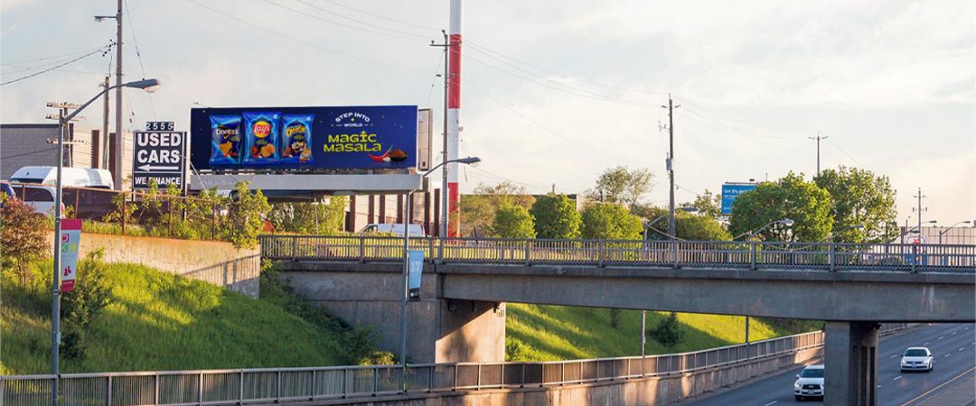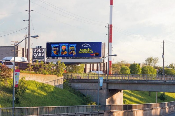 位于 Steeles Ave. W.(斯蒂尔斯西街),该道路是多伦多及周边地区重要的东西向跨区主干道,日常车流量大,涵盖跨区通勤、购物、探亲等多类人群,能打破单一社区的流量局限。距离 Dufferin St.(达弗林街)西侧 1.2 公里,处于两条主干道之间的核心路段,既承接 Dufferin St. 带来的南北向车流,也覆盖 Steeles Ave. W. 本身的东西向车流,形成双向流量叠加,曝光基数更稳定。