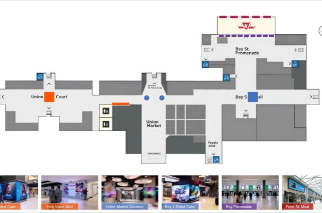 Union Station 是加拿大最大的铁路枢纽,也是多伦多最繁忙的交通中心,每天有数十万通勤和旅行人群经过。站点周边是金融区,聚集大量高收入的商务人士、白领和游客,广告受众消费能力强。地铁、火车、长途汽车及机场快线(UP Express)在此交汇,广告能够触达本地居民、跨城通勤者和国际旅客。电子广告屏设置在人流必经区域,乘客候车、换乘和通行时均可反复看到,增强品牌记忆。电子屏幕可播放视频、动画和动态图像,视觉冲击力强,更能吸引注意力。在加拿大地标性车站投放广告,有助于提升品牌国际化和权威形象。