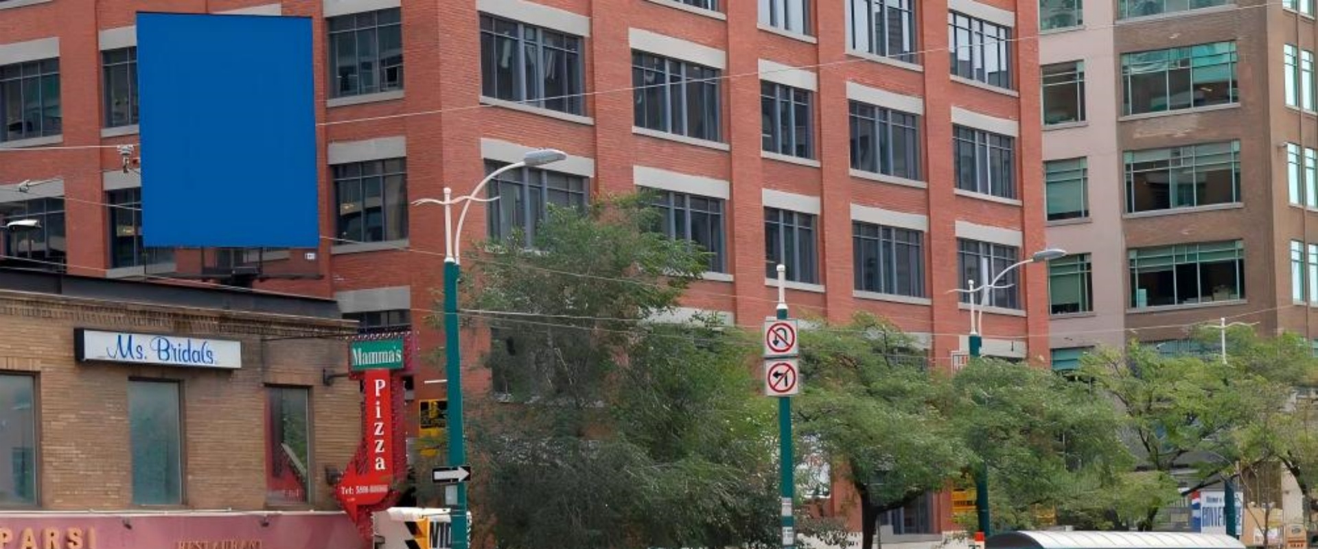位于多伦多市中心 Downtown Core 主干道 Spadina Ave 上,紧邻 Queen West 时尚购物区与 King West 娱乐/餐饮区,全天候人流密集。道路承载南北通勤主流量,日均车流量大,且市中心车速较慢,广告可见时间更长。距 Richmond St. W. 交叉口仅 7 米,红灯等候的车辆与行人均可正面看到广告,带来更高的驻留曝光时长。广告面朝北,能拦截南向车流和步行人群视线,无遮挡、视距长,远处即可捕捉到广告内容。