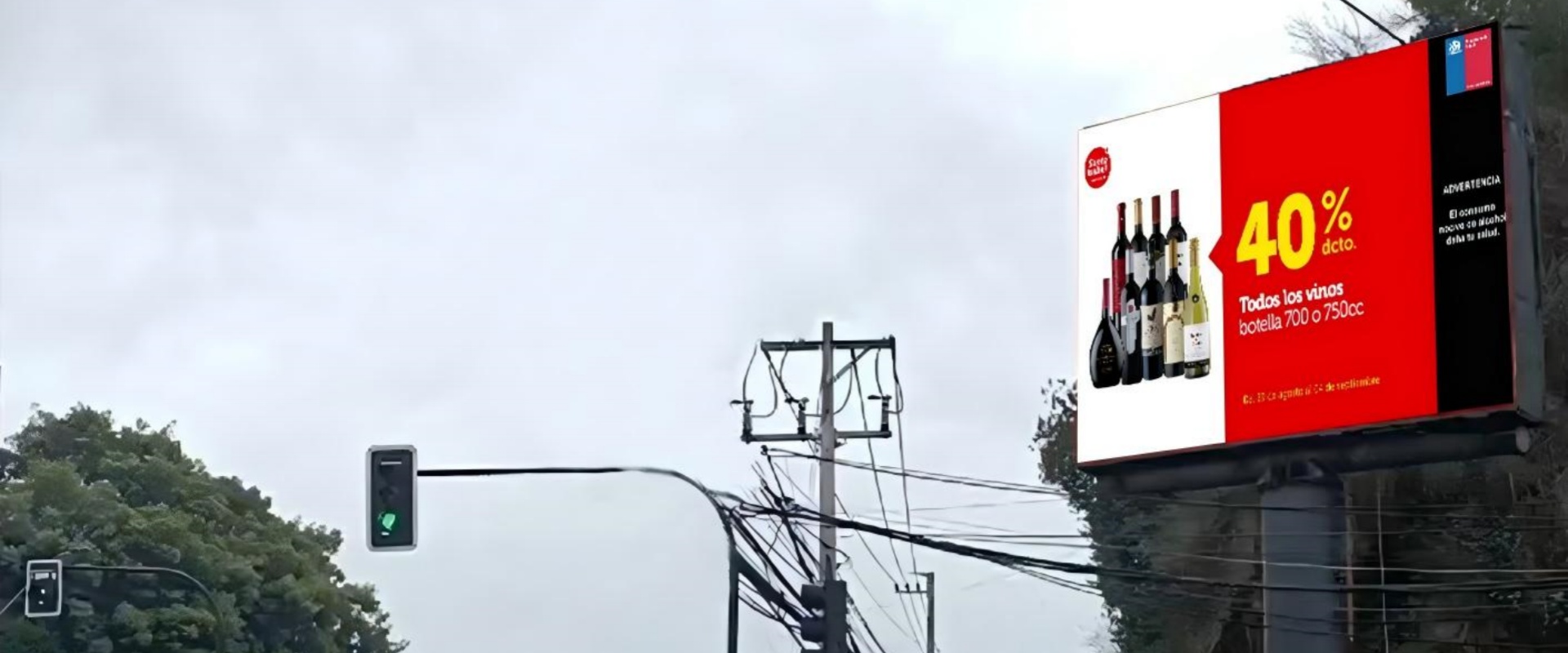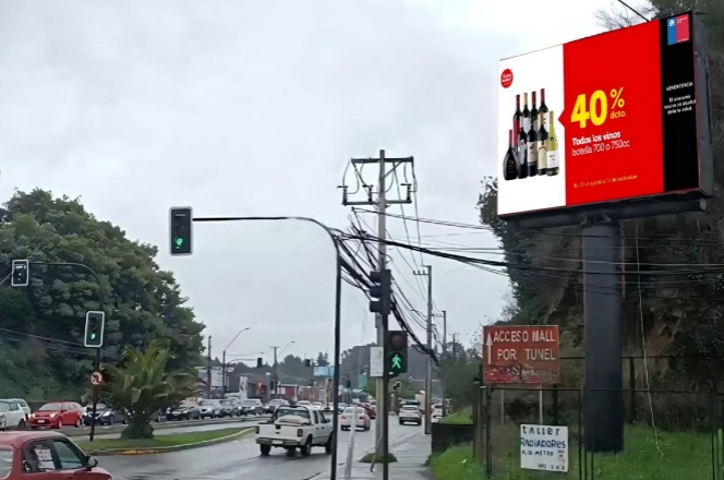 Paicaví 是连接 Concepción 市中心与 Mall Plaza Trébol 购物中心的重要通勤主路,是该市最繁忙、最重要的车道之一。该购物中心是该区域最大商业综合体,广告点位直指主要消费目的地,具有商业联动效果。该路段不仅服务私家车与公交,也有大量物流运输与上下班通勤车辆,全天候高流量保障广告曝光频次。面向商场方向的通行车辆多处于低速/等红灯/缓行状态,极利于观看广告内容与记忆品牌信息。