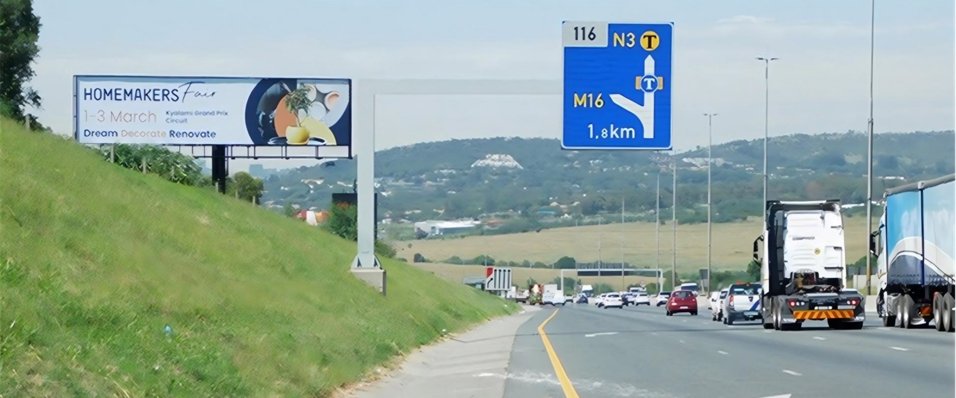 该段N3是连接约翰内斯堡北部(如Midrand、Pretoria)和东部(Bedfordview、Edenvale)的主要高速路段之一。面向方向为早晚高峰通勤主线,每天成千上万的上班族、商务人员和居民通过此路段,确保广告超高曝光率。广告在此段展示,可在受众回家或出行途中反复强化品牌印象,形成品牌日常记忆点。终点方向的Bedfordview与Edenvale也是约堡最成熟的中高端住宅区之一。