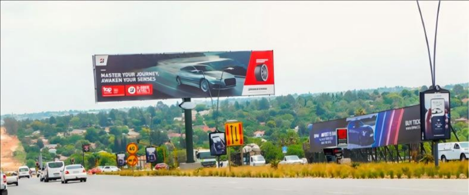 Allandale Road 是连接 N1 高速公路和 Kyalami 的重要道路,N1 作为主要交通干线,车流量大,而 Allandale Road 承接了从 N1 前往 Kyalami 的车辆,包括通勤者、商务出行人员和游客等,能为广告提供大量的曝光机会,让众多过往人员看到广告内容,有助于提升品牌知名度。Kyalami 地区有国际会议中心等场所,会吸引国内外宾客,这使得前往该地区的路段人流量和车流量进一步增加,为广告带来更广泛的受众基础。多个大牌不间断连续接触,有助于提高拦截率。