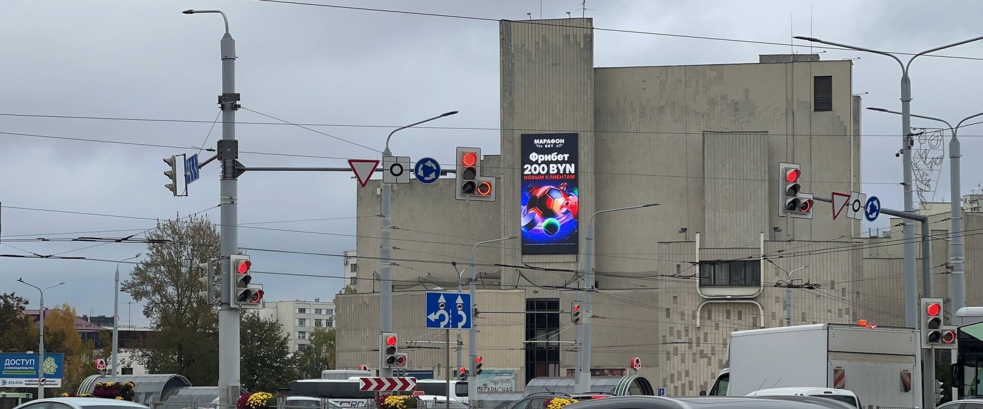 剧院位于米亚斯尼科娃街(Myasnikova Street)44 号,紧邻列宁广场,距离明斯克火车站仅 900 米,到列宁广场地铁站也仅 700 米。同时周边路网发达,不管是乘坐公共交通前往市中心游览、办公的人群,还是自驾穿梭于城市核心区域的车辆,都能轻松看到剧院外立面的广告。优越的交通区位让广告不仅能覆盖观演人群,还能触达通勤、旅游、办事等不同场景的流动人群,大幅拓宽了广告的受众覆盖范围。