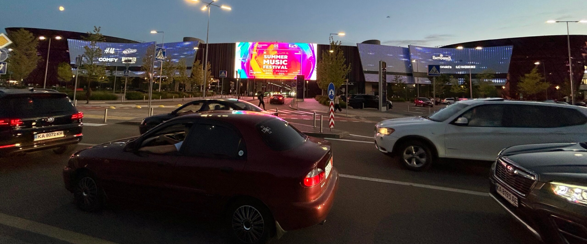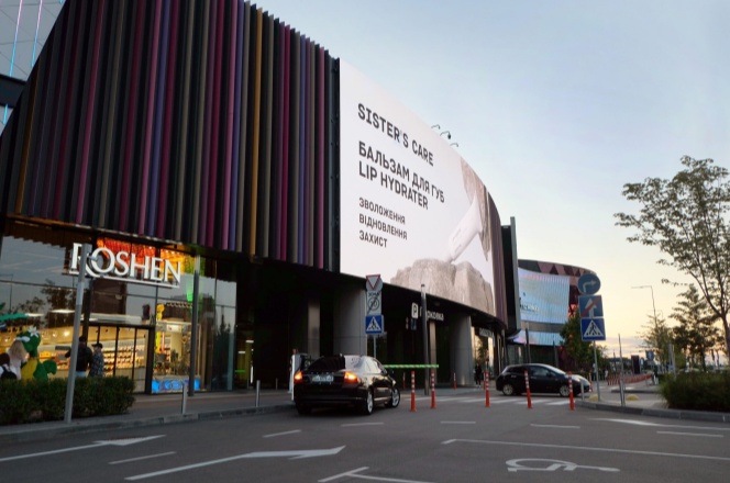 购物中心总面积达 30 万平方米,配套 3500 个车位,入驻 500 余家商户。涵盖服装、电子等连锁品牌,以及 15 厅影院、50 余家餐厅和娱乐综合体,日均吸引大量购物与休闲人群,确保广告高频触达。项目位于基辅环形公路这一核心交通干线,媒体立面不仅面向商场访客,还能覆盖过往车辆及周边行人,突破商场本身的受众边界。广告投放于受众处于购物、休闲的场景中,易激发即时消费意愿,提升从广告触达到实际转化的概率。