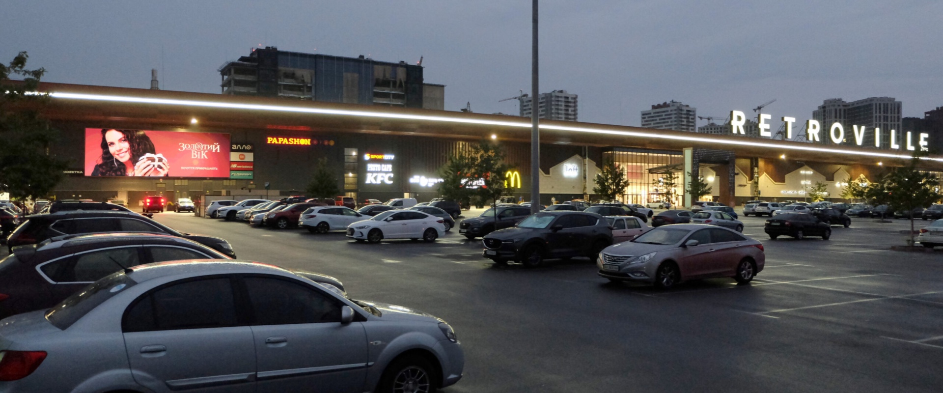 该购物中心地处基辅人口稠密的温诺格拉达尔区,仅该区域就有 25 万人,还能辐射周边约 200 万居民。同时周边有多座在建住宅综合体,未来客流还将持续增长。此外,途经商场的公交与专线出租车线路众多,媒体立面既能被商场访客看到,也能触达大量通勤的车辆与行人。商场入驻超 250 个各类品牌门店,涵盖平价与潮流服饰、珠宝、运动装备等多种品类,还有大型健身俱乐部和儿童游乐中心,能吸引从儿童到中老年的不同年龄段人群。